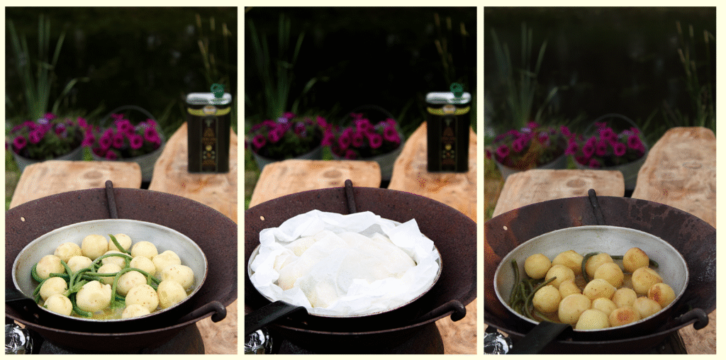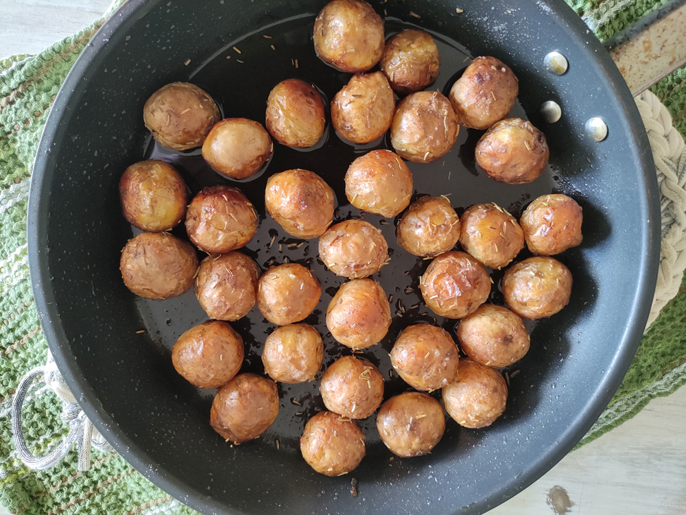 Lihtsalt pestud väike kartul pannile ja praadida kaane all nii pruuniks, kui soov on.
