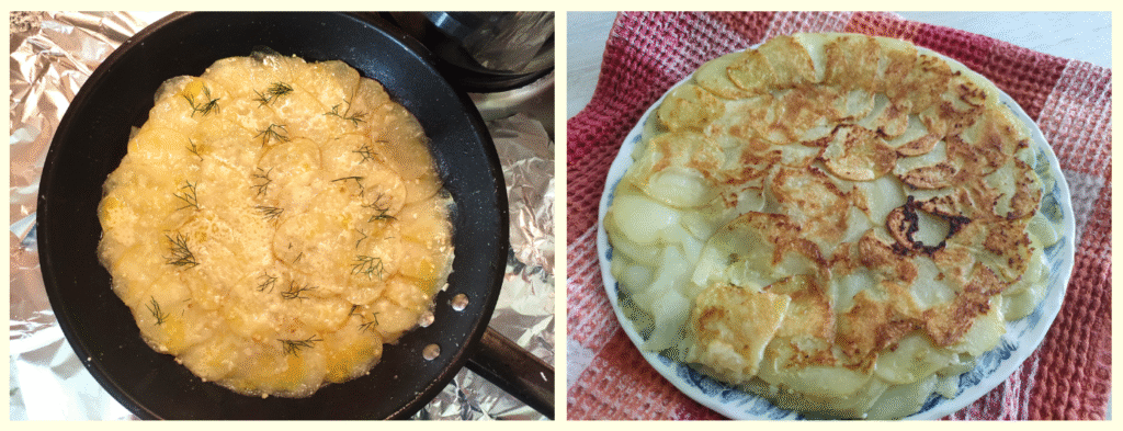 Suuremad värsked kartulid viilutada “mandoliinil” või ka tavalisel riivi viilutajal. Lao kihiti oliiviõlisele pannile. Iga kihi vahele veidi soola ja soovi korral küüslauku või tüümiani või riivitud juustu.